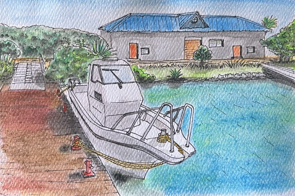 以前、海外漁業協力案件で働いていたミクロネシア連邦の東端に位置するコスラエ島。島内の自分が写した写真を元に、桟橋の風景を書いて見ることにした。ハードルが一気に高くなったので、長い間本棚にしまっておいた野村重存著:「風景を描くコツと裏技」を参考にして描いてみた。