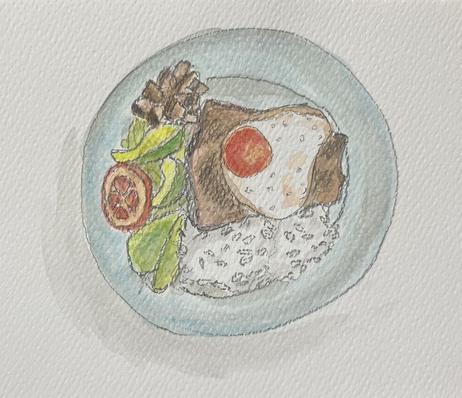 家に帰ってからメインディッシュを鉛筆で描いて、透明水彩絵の具で塗ってみた。今回の下絵の線は鉛筆で描いてみたが、ピグマペンの方が線がハッキリして好きだ。次の絵は鉛筆を使わずに、直接ピグマペンだけで下絵を描いてみたい。色はまだ参考書をしっかりと読んでいないので、エイヤッと気合いだけで塗ってみた。