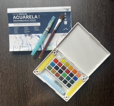 かなり前に日本の画材屋で買ったターレンス社のプチカラー24色固形透明水彩絵の具と筆ペンを、引き出しの奥のからひっぱりだした。紙は、どれにしたら良いかわからなかったので、メデジンの画材屋でいくつか見つけた。あまり高くない、ALPEN社の水彩用ブロック画用紙(140X215mm, 300g, 50枚)にした。とりあえず、練習するには必要最低限度の道具が揃ったので、9月から描きはじめることにした。