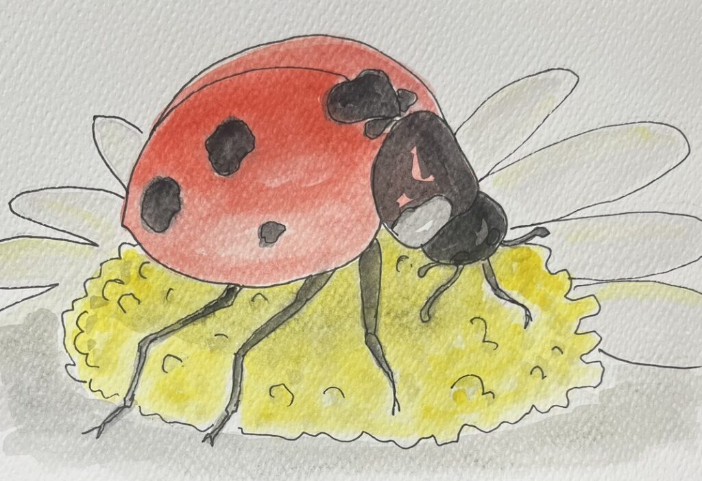 ネットで見つけたてんとう虫の画像を元に描いて見たが、やっぱり色が良くない。また花がよくないので、とても不満足な出来だ。