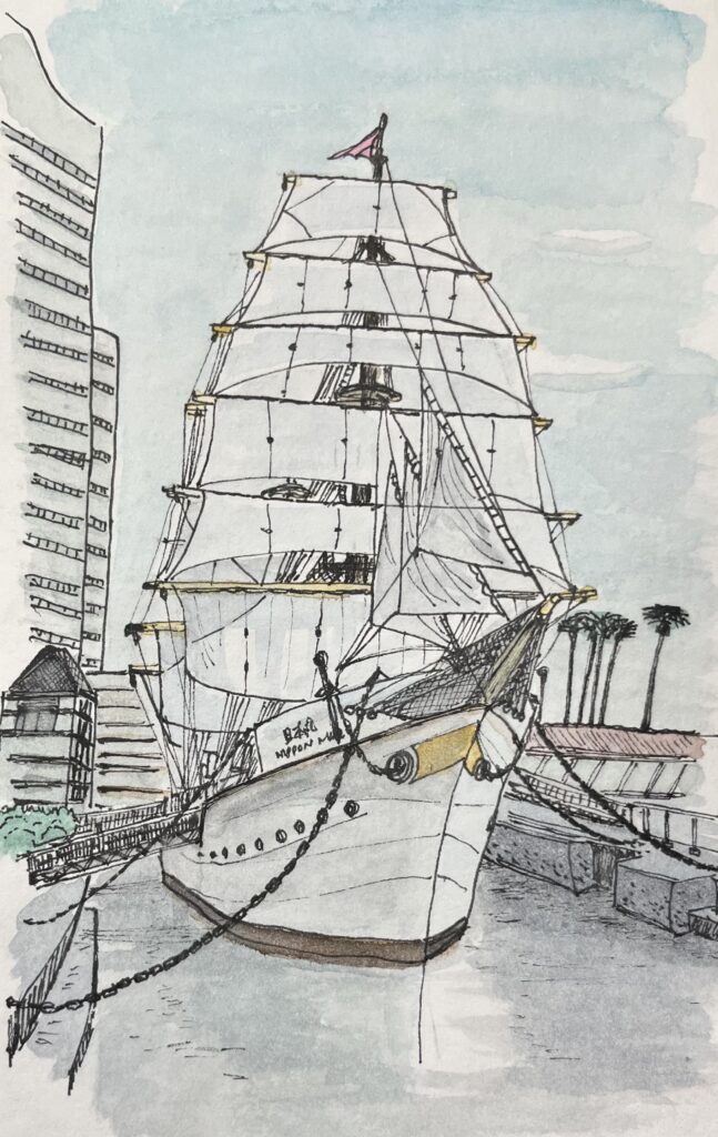 11月に横浜へ友人に会いに行った時、たまたま待ち合わせ場所の桜木町駅に早く着いてしまった。その日は天気も良くて、駅前を歩くとすべての帆が張られた日本丸が見えた。総帆展帆と言うらしい。こんな格好のよい日本丸を初めて見たので、少し興奮気味に色々な角度から写真を撮った。その中で一番気に入った構図の写真を元に絵を描いてみた。